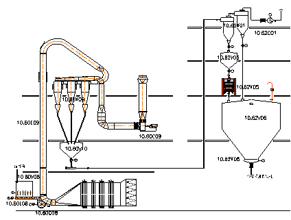 ⑶ 離心風(fēng)機(jī)正壓吹送是稀相輸送,主要是設(shè)計(jì)好輸送風(fēng)量、固氣比、風(fēng)壓、輸送管道直徑、卸料旋風(fēng)分離器。輸送量為16.67t/h,風(fēng)速為35m/s,物料密度為0.1%。