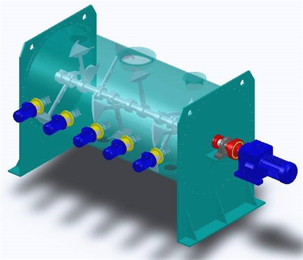 混合機結構主要由傳動部分、臥式筒體、犁刀組軸、飛刀組、出料閥、噴液裝置等組成。混合機傳動部分包括帶電機擺線針輪減速機、聯(lián)軸器,主要把電機的運動變?yōu)樾枰乃俣群团ぞ貍鹘o復雜刀軸。